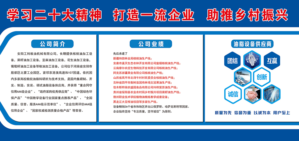 安陽工科糧油機(jī)械有限公司,長期提供核桃油加工設(shè)備,茶籽油加工設(shè)備,菜籽油加工設(shè)備,亞麻油加工設(shè)備,花生油加工設(shè)備,葡萄籽油加工設(shè)備等糧油加工設(shè)備,公司位于河南省安陽市殷都區(qū)北蒙工業(yè)園區(qū),緊鄰京港澳高速和107國道,依托國內(nèi)多家高校糧院油脂科研所為技術(shù)支持,是國內(nèi)集研制、開發(fā)、制造、安裝、調(diào)試油脂設(shè)備供應(yīng)商,并獲得“重合同守信用AAA級企業(yè)”、“政府采購優(yōu)秀供應(yīng)商”、“中國綠色環(huán)保產(chǎn)品”“中國教學(xué)設(shè)備行業(yè)國家重點推薦產(chǎn)品”、“全國質(zhì)量、信譽(yù)、服務(wù)AAA級示范單位”、“企業(yè)信用評價AAA級信用企業(yè)”、“國家權(quán)威檢測質(zhì)量合格產(chǎn)品”等榮譽(yù)。先后承建了新疆和田林業(yè)...